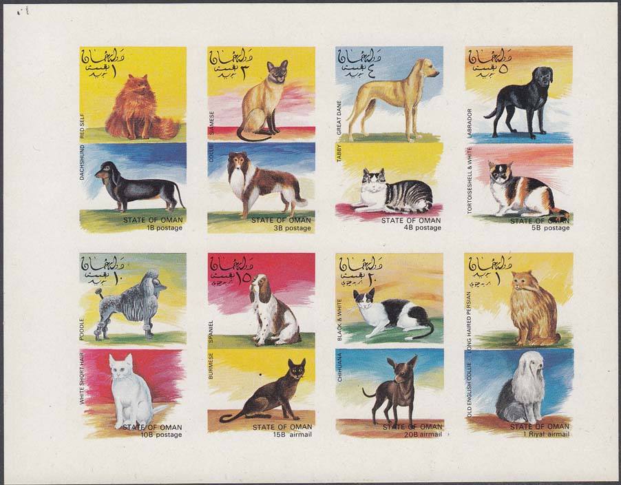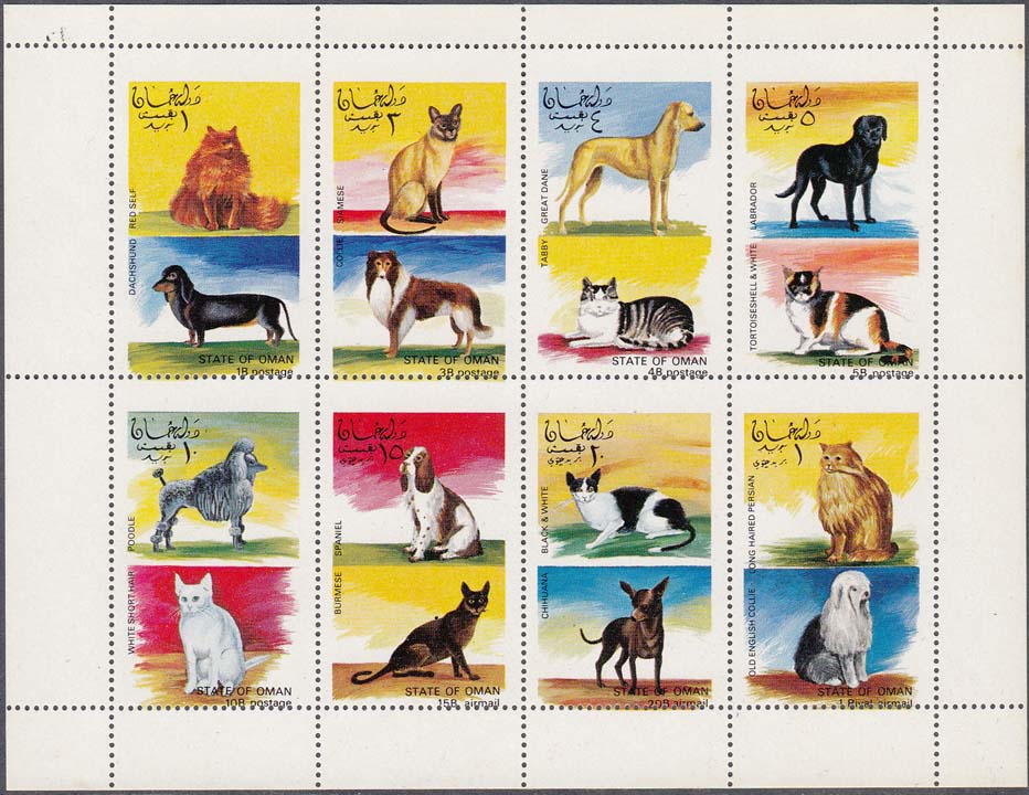 1972 г. Разм. по перфорации 32 х 51. Многоцветная печать на белой бумаге. Зубц. 13 3/4 и БЗ. С клеем. В центре изображения кошек и собак различных пород. Название страны и номинал на арабском и английском языках.