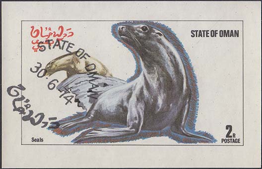 1974 г. Разм. 89 х 57 мм. Многоцветная печать на белой глянцевой бумаге. В центре в прямоугольной рамке два морских котика.