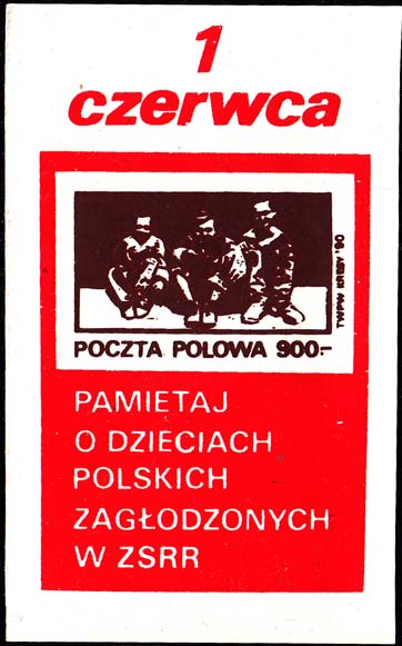 1990 г. Разм. 62 х 98 мм. Одноцветная печать на белой глянцевой бумаге. В центре на сплошном фоне фантастическая марка "Полевой почты" с изображением трех заключенных. Сверху текст на польском языке: "1 июня". Внизу текст на польском языке в четыре строки: "Помните о польских детях, заморенных голодом в СССР".