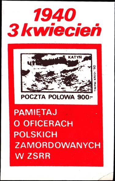 1990 г. Разм. 62 х 98 мм. Одноцветная печать на белой глянцевой бумаге. В центре на сплошном фоне фантастическая марка "Полевой почты" с изображением расстрела в Катыни. Сверху текст на польском языке: "1940 3 апреля". Внизу текст на польском языке в четыре строки: "Помните о польских офицерах, убитых в СССР".