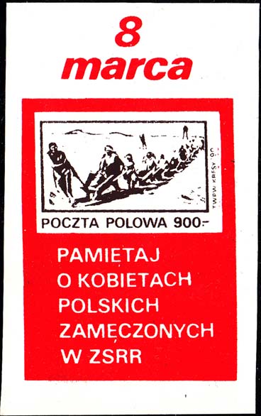 1990 г. Разм. 62 х 98 мм. Одноцветная печать на белой глянцевой бумаге. В центре на сплошном фоне фантастическая марка "Полевой почты" с изображением заключенных на работе. Сверху текст на польском языке: "8 марта". Внизу текст на польском языке в четыре строки: "Помните о польских женщинах, замученных в СССР".