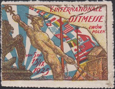 1925 г. Разм. рамки 57 х 42 мм. Многоцветная печать на белой бумаге. Нерегулярная зубц. С клеем. В прямоугольной рамке скульптура Меркурия и флаги стран-участниц ярмарки. В правом верхнем углу текст в четыре строки на немецком языке: "V международная Восточная ярмарка. Львов Польша". В правом нижнем углу дата: "...(?)... 15/IX 1925".