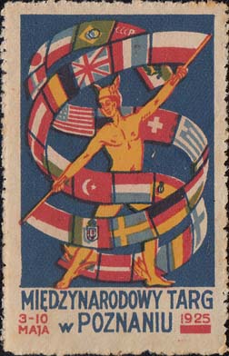 1925 г. Разм. 43 х 67 мм. Многоцветная печать на белой бумаге. Нерегулярная зубцовка. В центре на сплошном фоне аллегорический рисунок - бог торговли Гермес с флагами стран-участниц ярмарки. Внизу текст на польском языке в две строки: "Международная ярмарка в Познани 3-10 мая 1925".