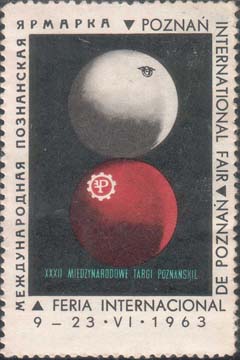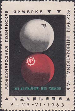 1962 г. Разм. по перфорации ≈ 41 х 54 мм. Многоцветная печать на белой бумаге. Зубц. 11 1/4. С клеем. В центре на сплошном фоне эмблема выставки. По периметру текст на нескольких языках, в том числе на русском: "Международная Познанская ярмарка".