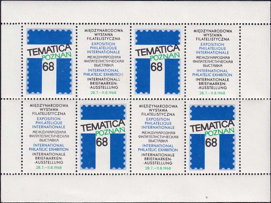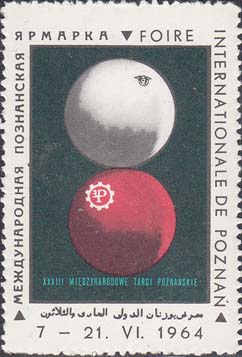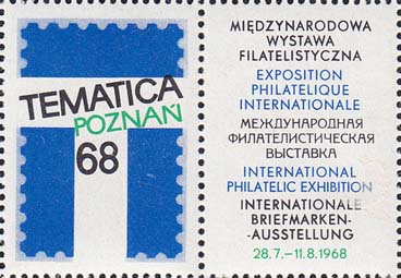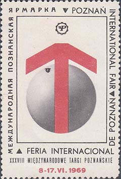 1969 г. Разм. по перфорации ≈ 41 х 60 мм. Двухцветная печать на белой бумаге. Зубц. 11. С клеем. В центре эмблема ярмарки. Внизу текст в прямо-угольной рамке эмблема выставки. По наружному периметру текст на разных языках, в том числе и на русском: «Международная Познанская яр-марка». Внизу дата: «8-17.VI.1969».