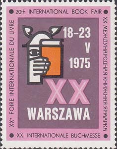 1975 г. 18-23.05.1975 г. Разм. рис. 36 х 46 мм. Многоцветная печать на белой мелованной бумаге. Зубц. 11 1/4. С клеем. В центре на сплошном фоне сверху эмблема Варшавской книжной ярмарки и даты: "18-23 V 1973". Внизу текст на польском языке: "XX Варшава". По наружному периметру рамки текст на английском, немецком, французском и русском языках: "XX Международная книжная ярмарка".