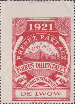 1921 г. 29.09.-05.10.1921 г. Разм. рис. 35 х 49 мм. Одноцветная печать на белой бумаге. Зубц. 11 1/2. С клеем. В декоративной рамке в центре городские постройки на фоне восходящего солнца. Сверху даты проведения выставки: «25.IX 5.X. 1921», Текст на разных языках: «Примите участие в Восточной ярмарке во Львове». Под рамкой выходные данные мелким шрифтом на польском языке: ««Karpalit» 3 p. Akc. Lwow».