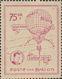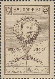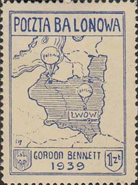 1939 г. 03.09.1939 г. Одноцветная печать на белой бумаге. Зубц. 11 1/2. С клеем. В прямоугольной рамке в центре различные рисунки. Тексты на разных языках: "Баллонная почта. Гордан Беннетт. Лбвов 1939" и номинал.