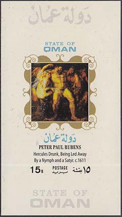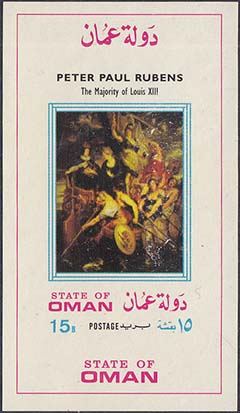 1980 г. Разм. 40 х 70 мм. Многоцветная печать на белой глянцевой бумаге. С клеем. В центре в двойной прямоугольной рамке картины Рубенса. Тексты на английском и арабском языке и номинал.