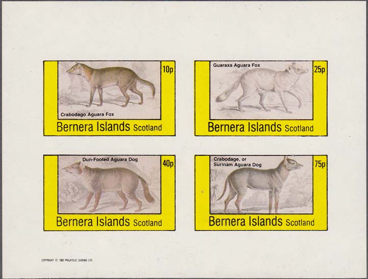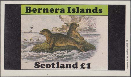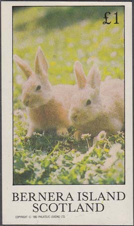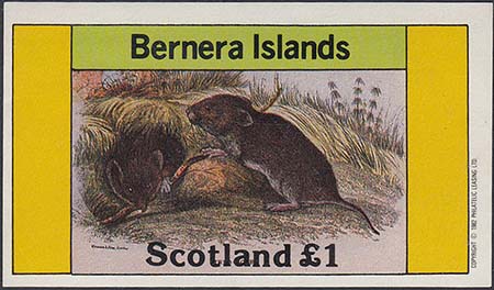 1982 г. Разм. 76 х 43 мм. Многоцветная печать на белой глянцевой бумаге. В центре два грызуна у норы. Сверху текст на английском языке: "Barnera Islands". Внизу текст: "Scotland" и номинал.