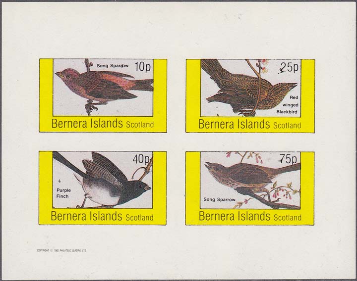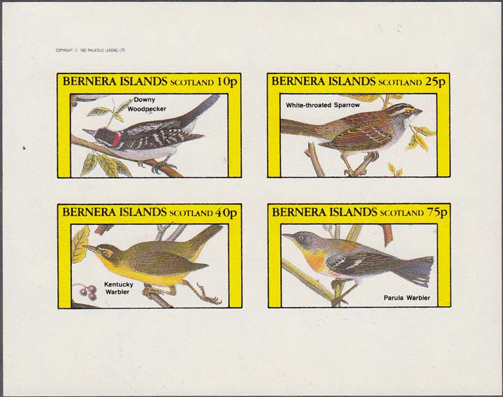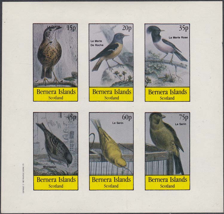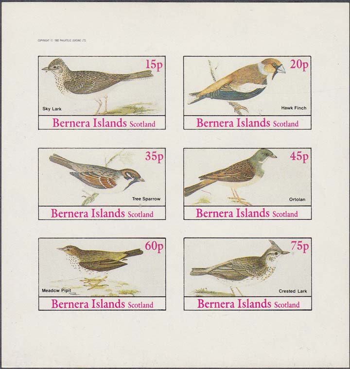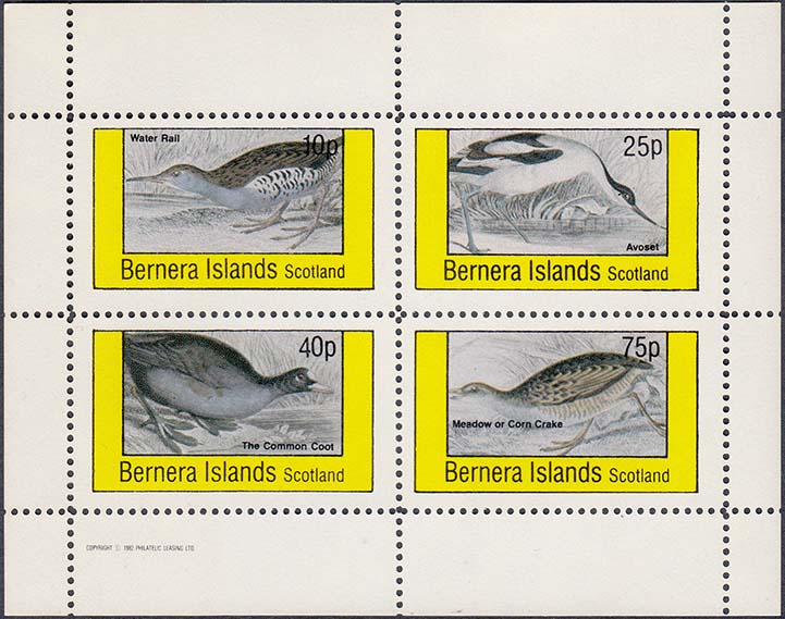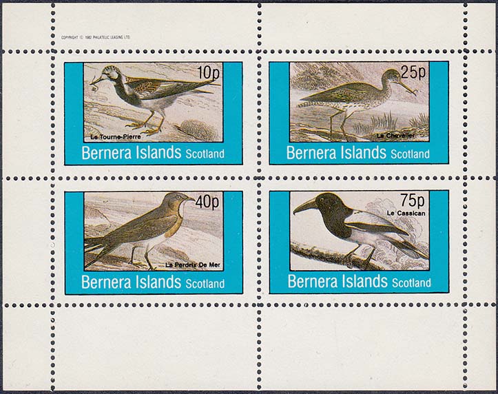1982 г. разм. рамки 44 х 25 мм. Многоцветная печать на белой глянцевой бумаге. Зубц. 11 и Б.З. с клеем. В прямоугольной рамке в центре птицы различных видов с пояснительными текстами на английском языке. В правом верхнем углу номинал. Внизу текст на английском языке: "Barnera Islands Scotlant".