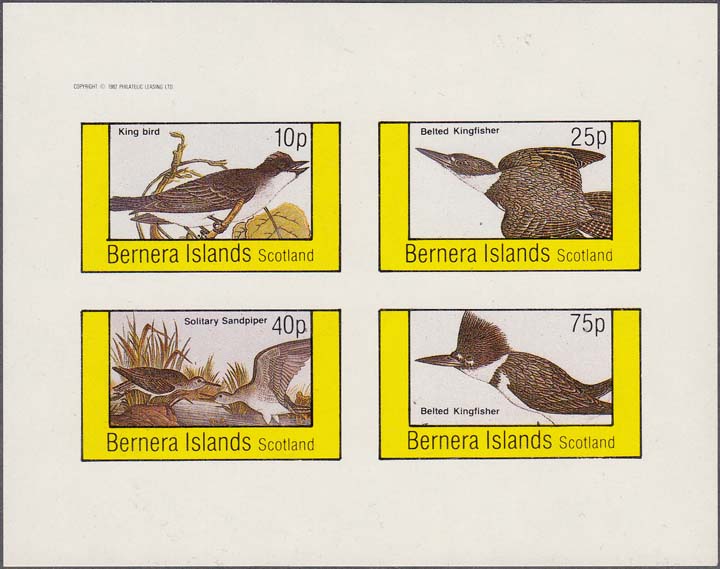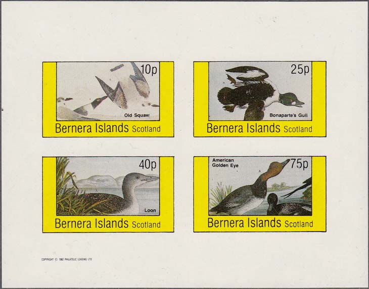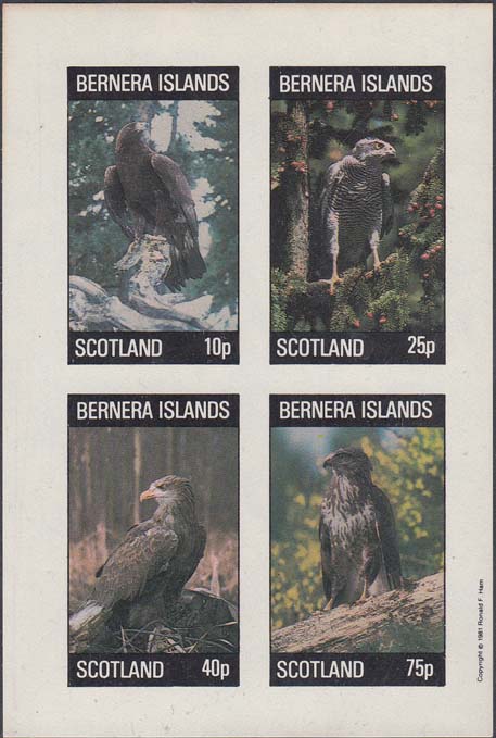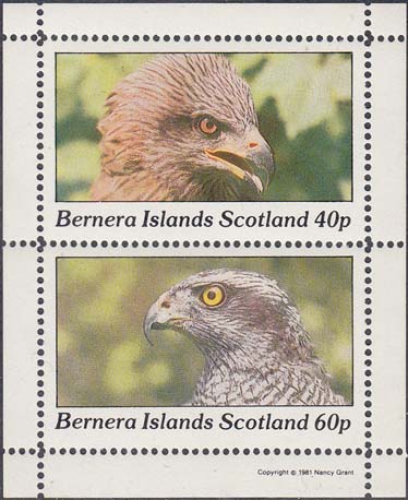 1982 г. Блок разм. 63 х 77 мм. Многоцветная печать на белой глянцевой бумаге. Зубц. 12 1/2. В центре две марки с изображениями хищных птиц. Внизу текст на английском языке: "Barnera Islands Scotland" и номинал.