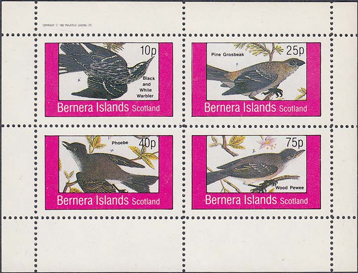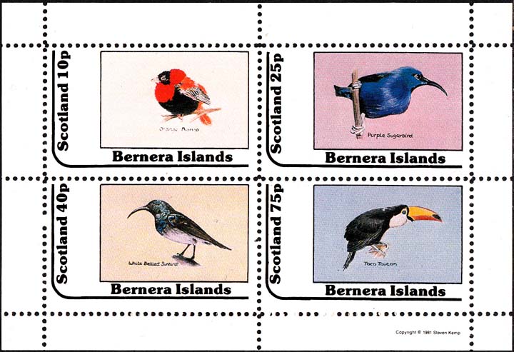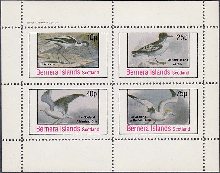 1982 г. Разм. рамки 44 х 25 мм. Многоцветная печать на белой глянцевой бумаге. Зубц. 11. и Б.З. С клеем. В центре в прямоугольной рамке птицы различных видов с пояснительной подписью на английском языке. Сверху текст на английском языке: "Barnera Islands Scotlant".