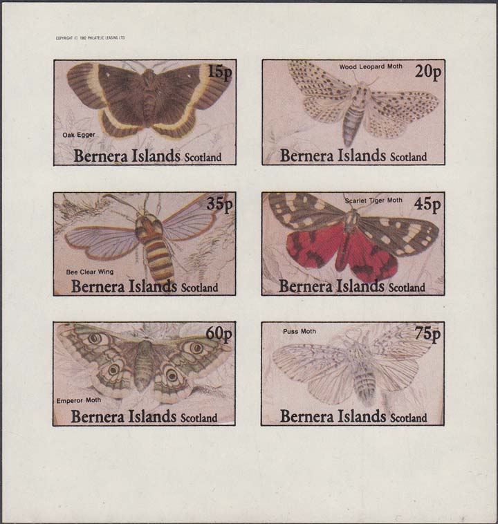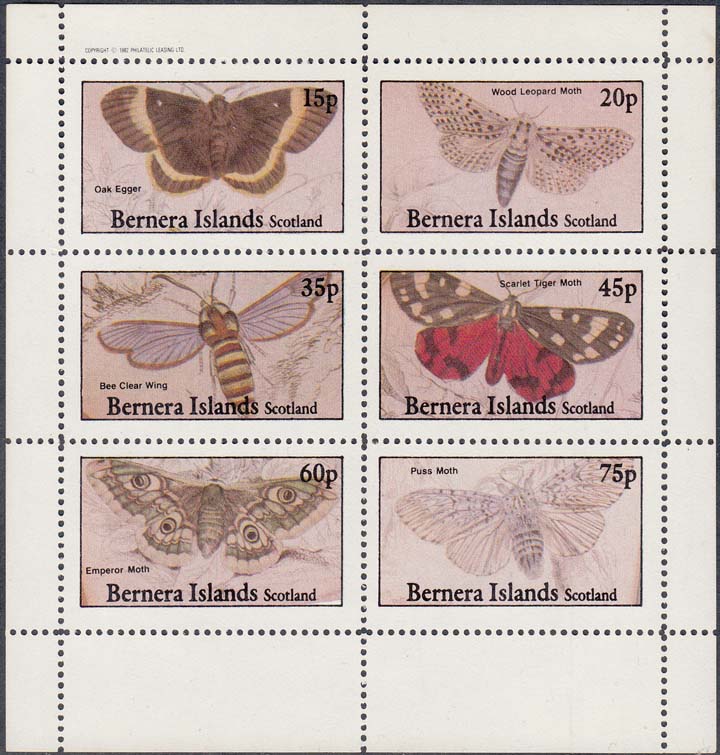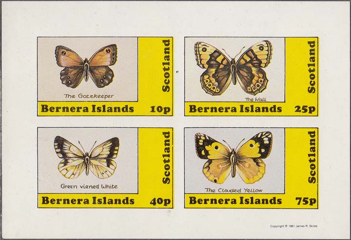 1982 г. Разм. 45 х 25 мм. Многоцветная печать на белой глянцевой бумаге. Зубц. лин. 10 3/4 и Б.З. С клеем. В центре в прямоугольной рамке бабочки различных видов и пояснительный текст на английском языке. В правом верхнем углу номинал. Внизу текст на английском языке: "Barnera Islands Scotland".