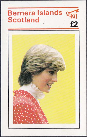 1982 г. Листок разм. 56 х 89 мм. Многоцветная печать на белой глянцевой бумаге. С клеем. В центре портрет Принцессы Дианы в профиль. Внизу номинал и текст на английском языке.
