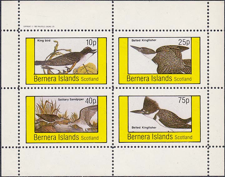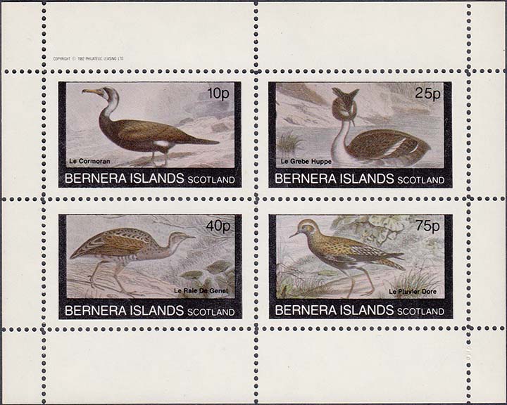 1982 г. Разм. рамки 44 х 25 мм. Многоцветная печать на белой бумаге. Зубц. 11. и Б.З. С клеем. В прямоугольной рамке птицы различных видов и пояснительный текст на английском языке. В правом верхнем углу номинал. Внизу текст на английском языке: "Barnera Islands Scotland".