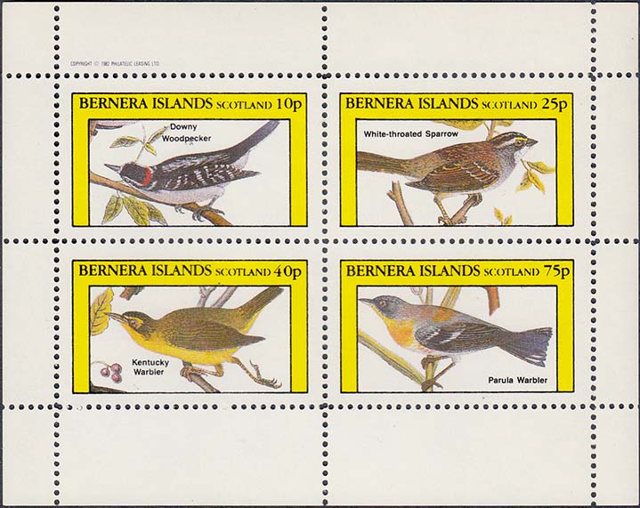 1982 г. Разм. 44 х 26 мм. Многоцветная печать на белой глянцевой бумаге. С клеем. В прямоугольной рамке в центре птицы различных видов с пояснительными текстами на английском языке. Внизу текст на английском языке: "Barnera Islands Scotland". В правом верхнем углу номинал.