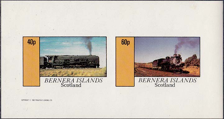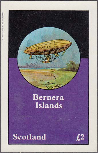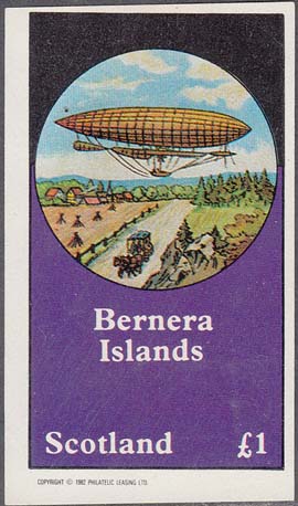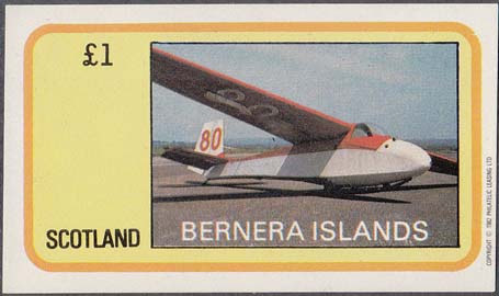 1982 г. Разм. 76 х 45 мм. Многоцветная печать на белой бумаге. С клеем. В центре изображение планера на аэродроме. Внизу текст на английском языке: "Barnera islands". Слева номинал и текст на английском языке: "Scotland".