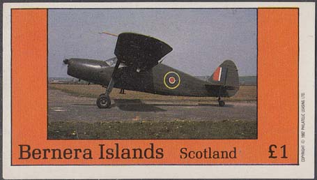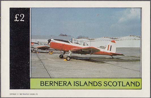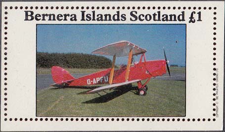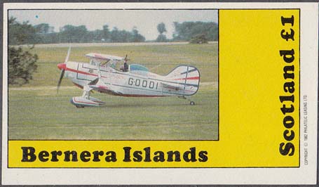 1982 г. Разм. 76 х 45 мм. Многоцветная печать на белой бумаге. С клеем. В центре самолет-биплан на аэродроме. Внизу текст на английском языке: "Barnera islands". Справа текст на английском языке: "Scotland" и номинал.