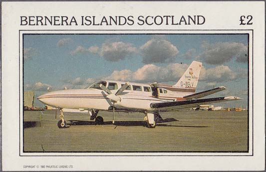 1982 г. Разм. 76 х 45 мм. Многоцветная печать на белой бумаге. С клеем. В центре самолет на аэродроме. Внизу текст на английском языке: "Barnera islands Scotland" и номинал.