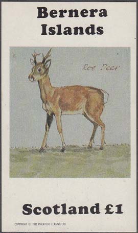 1982 г. Разм. 46 х 76 мм. Многоцветная печать на белой глянцевой бумаге. С клеем. В центре на сплошном фоне олень. Сверху и снизу название страны на английском языке и номинал.