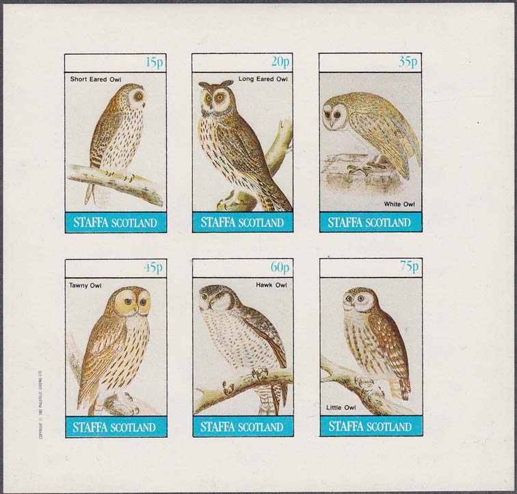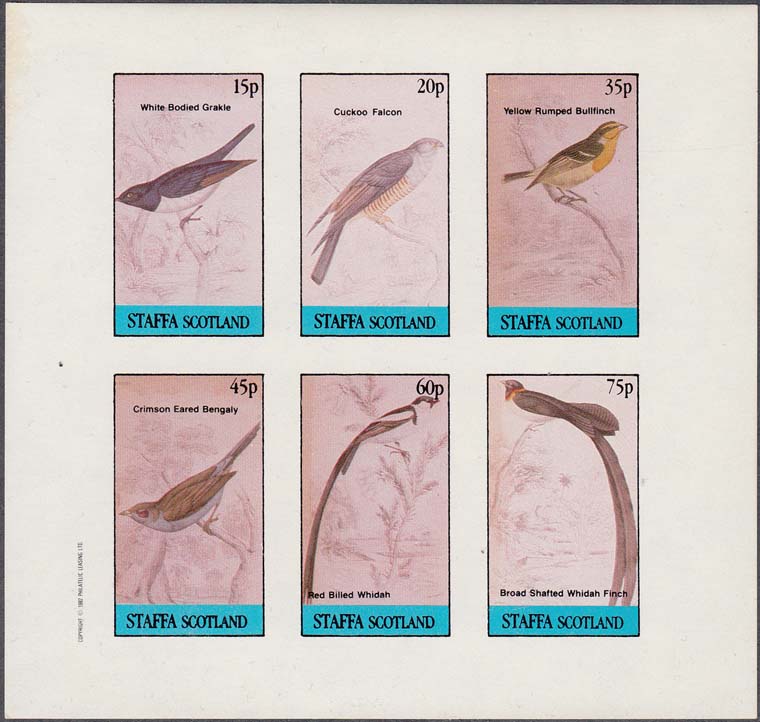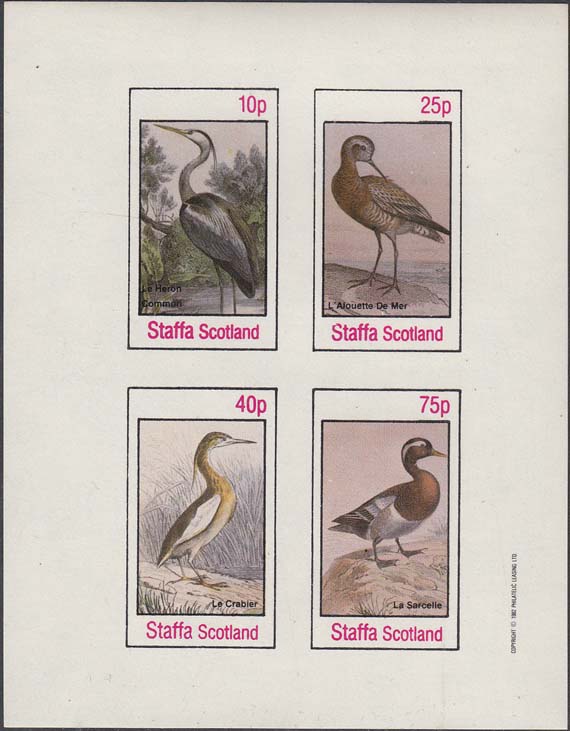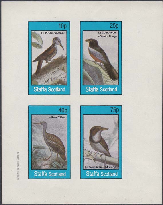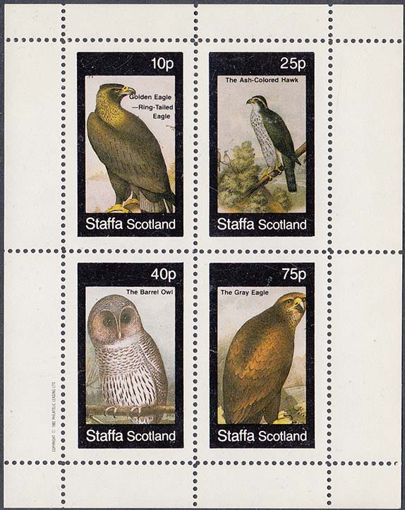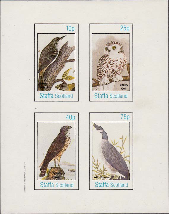 1982 г. Разм. рамки 25 х 44 мм. Многоцветная печать на белой бумаге. В прямоугольной рамке в центре птицы различных видов с пояснительными текстами на английском языке. В правом верхнем углу номинал. Внизу текст на английском языке: "Staffa Scotland".