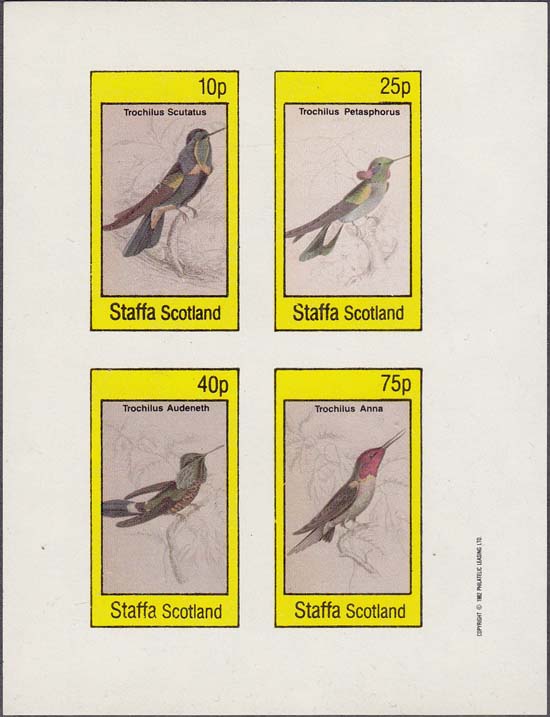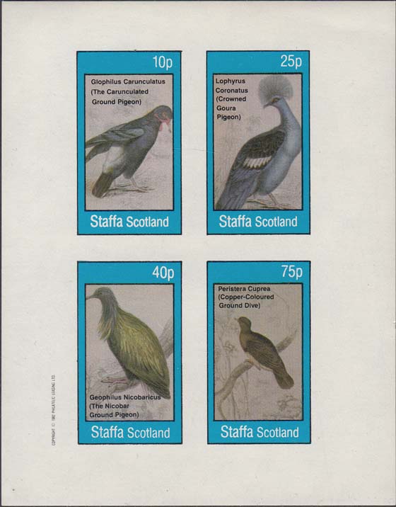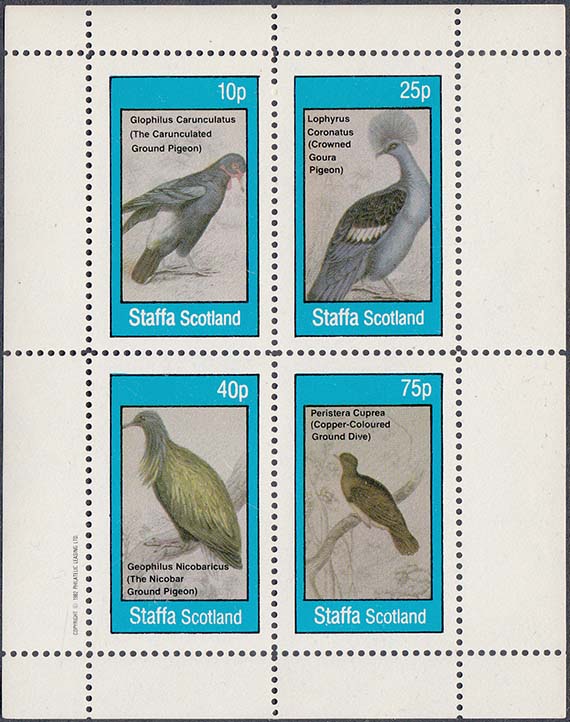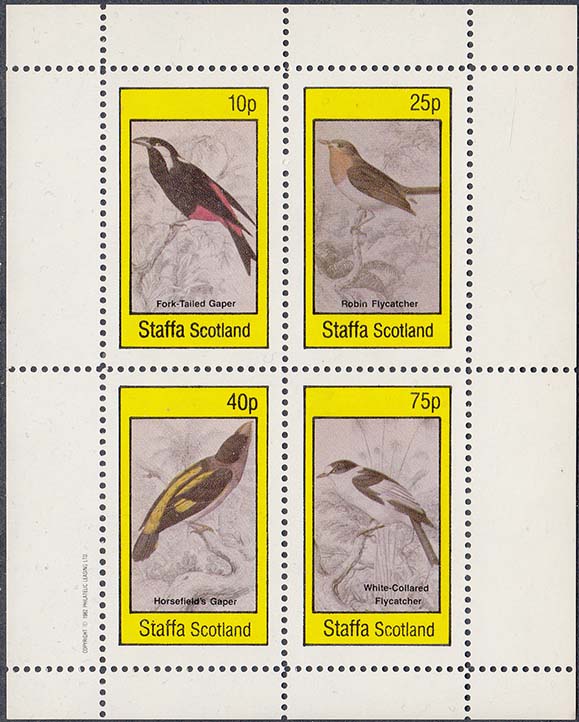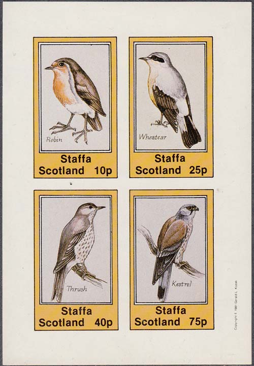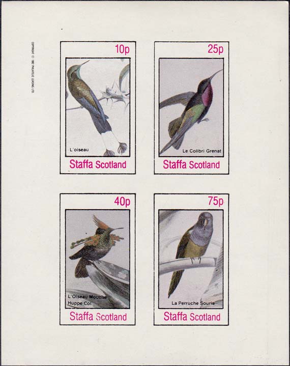 1982 г. Разм. рамки 25 х 44 мм. Многоцветная печать на белой глянцевой бумаге. В прямоугольной рамке в центре птицы различных пород с пояснительным текстом на английском языке. Справа сверх номинал. Внизу текст на английском языке: "Staffa Scotland".
