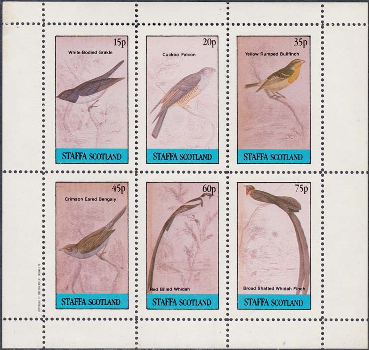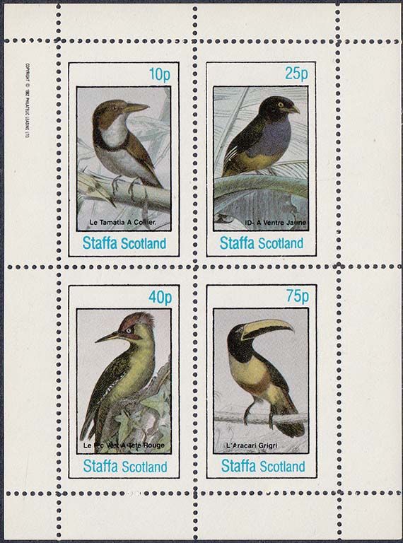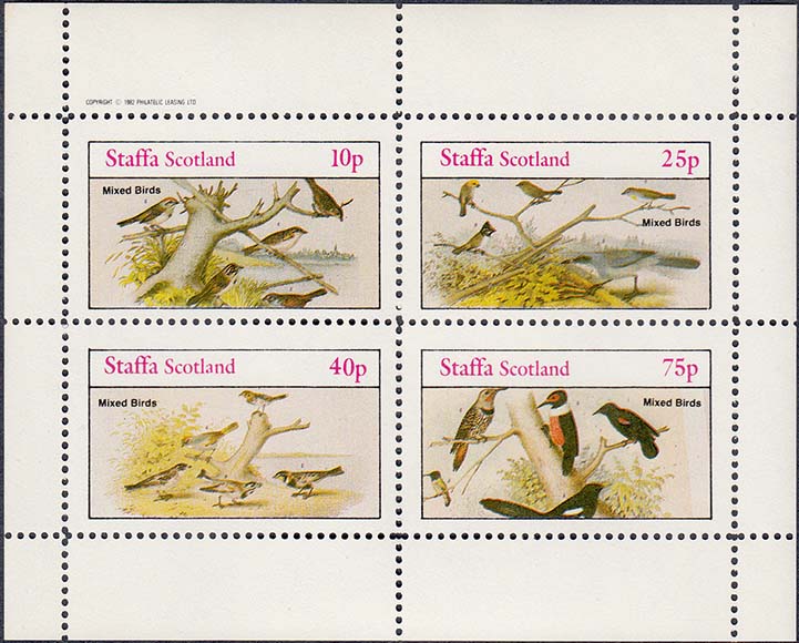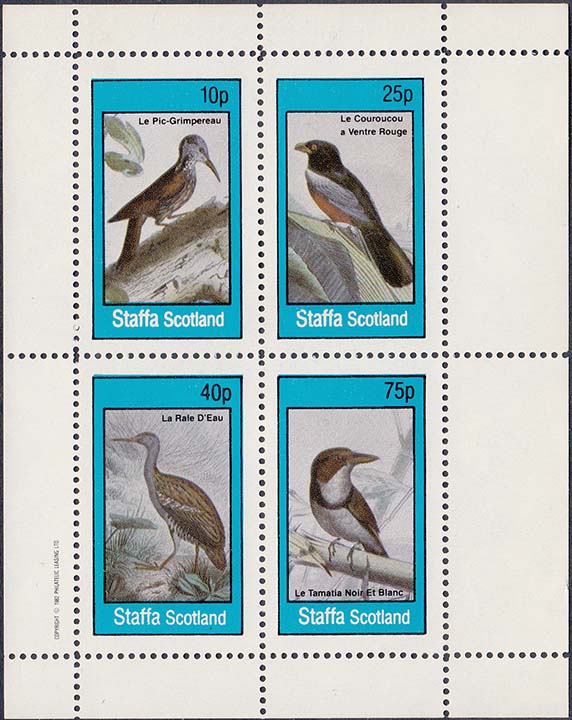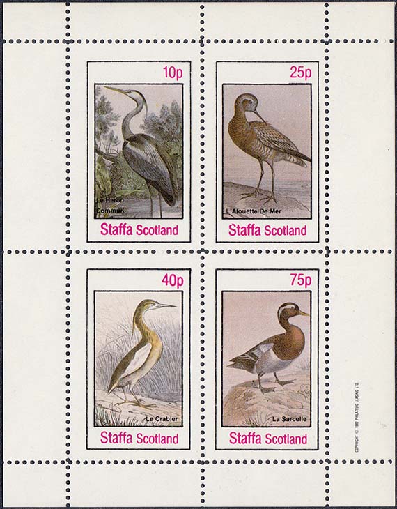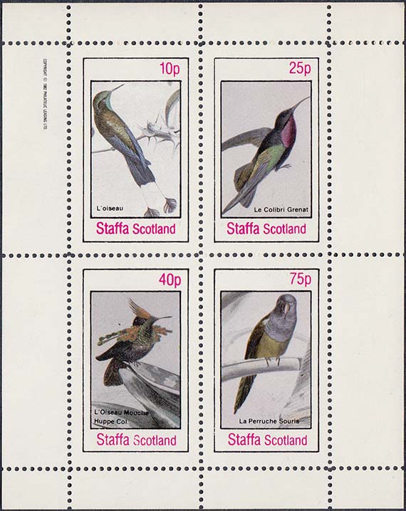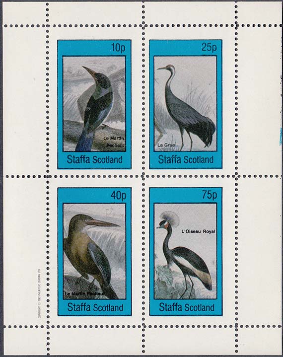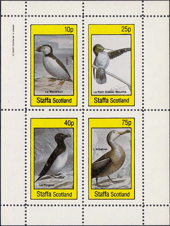 1982 г. Разм. 25 х 45 мм. Многоцветная печать на белой глянцевой бумаге. В центре в прямоугольной рамке птицы различных видов и пояснительный текст на английском языке. В правом верхнем углу номинал. Внизу текст на английском языке: "Staffa Scotland".