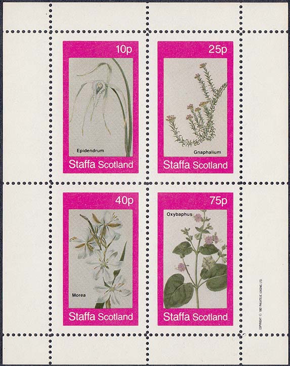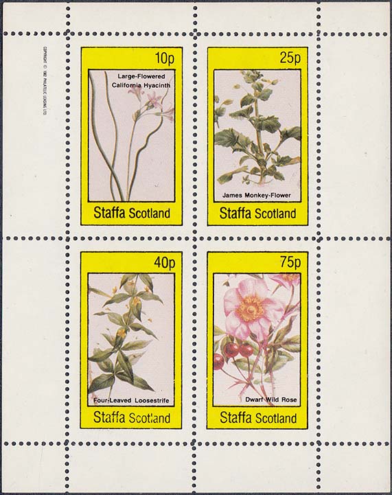 1982 г. Разм. 25 х 44 мм. Одноцветная печать на белой мелованной бумаге. В прямоугольной рамке в центре различные растения с пояснительными текстами на английском языке. Справа сверху номинал. Внизу текст на английском языке: "Staffa Scotland".