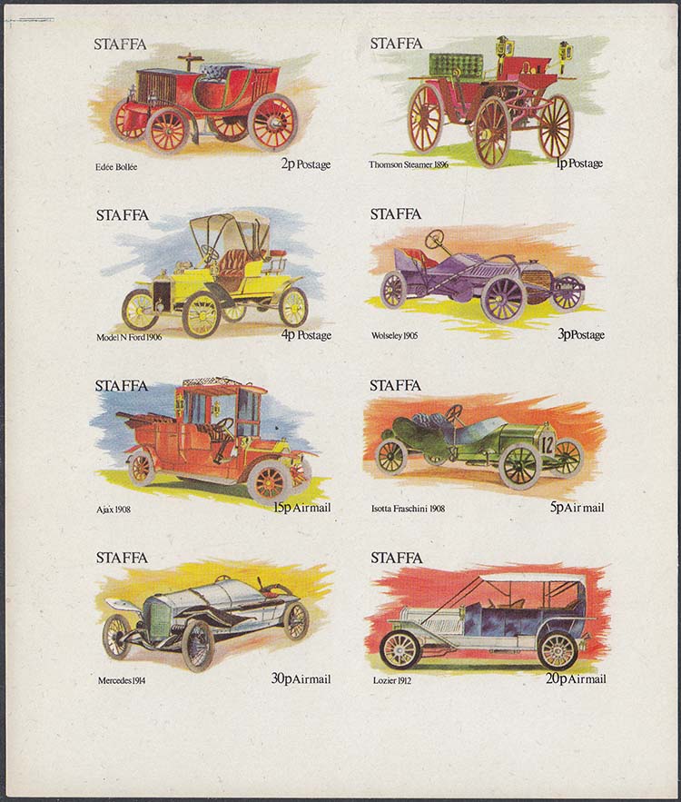 1982 г. Разм. 45 Х 26 мм. Многоцветная печать на белой глянцевой бумаге. В центре старинные автомобили различных марок с пояснительными текстами на английском языке.