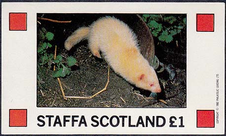1982 г. Блок разм. 76 х 45 мм. В центре грызун. Внизу текст на английском языке: "Staffa Scotland" и номинал.