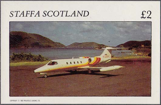 1982 г. Разм. 91 х 57 мм. Многоцветная печать на белой бумаге. С клеем. В центре в прямоугольной рамке реактивный самолет. Внизу текст на английском языке: "Staffa Scotland" и номинал.