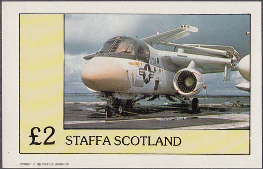 1982 г. Разм. 91 х 57 мм. Многоцветная печать на белой бумаге. С клеем. В центре в прямоугольной рамке самолет на палубе авианосца. Внизу текст на английском языке: "Staffa Scotland" и номинал.