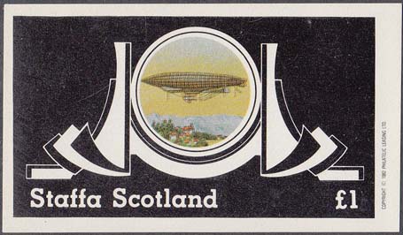 1982 г. Разм. 78 х 46 мм. Многоцветная печать на белой бумаге. С клеем. В центре на сплошном фоне в декоративной рамке дирижабль в полете. Внизу текст на английском языке: "Staffa Scotland" и номинал.