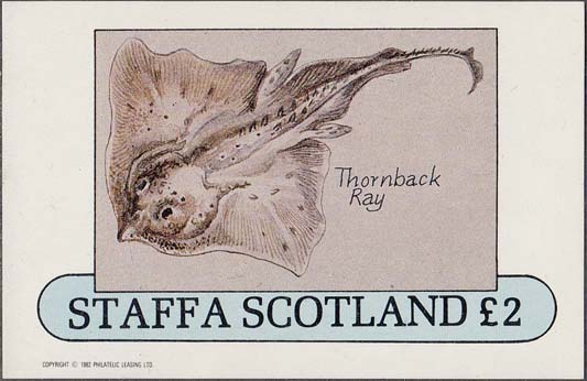 1982 г. Разм. 89 х 58 мм. Многоцветная печать на белой глянцевой бумаге. С клеем. В центре на сплошном фоне скат. Внизу название страны на английском языке и номинал.