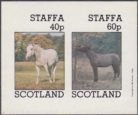 1982 г. Блок разм. 76 х 64 мм. Многоцветная печать на белой глянцевой бумаге. С клеем. В центре в прямоугольной рамке две марки с изображением лошадей. Сверху и снизу название страны на английском языке и номинал.