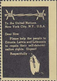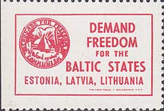 1980(?) г. Разм. рамки 34 х 20 мм. Одноцветная печать на белой глянцевой бумаге. Зубц. 11 3/4. С клеем. В прямоугольной рамке слева эмблема организации. Справа текст на английском языке в пять строк: "Требуем свободы для балтийских стран Естонии, Латвии, Литвы".