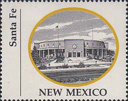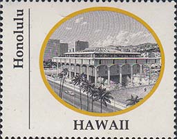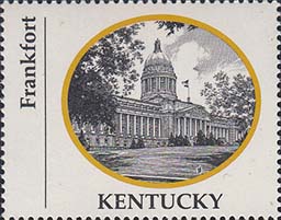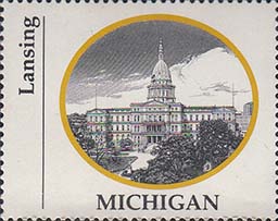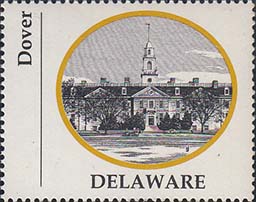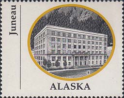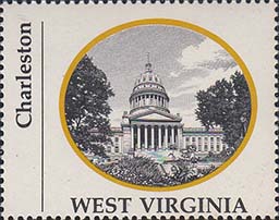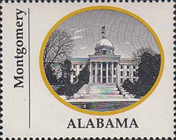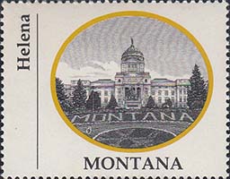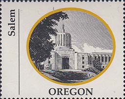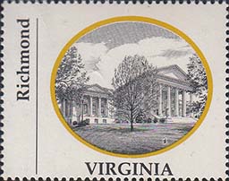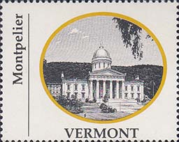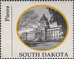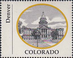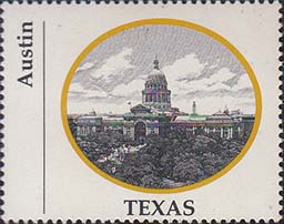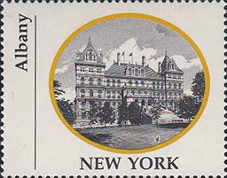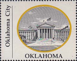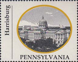 1970 г. Разм. по перфорации ≈ 44 х 35 мм. Двухцветная печать на белой глянцевой бумаге. Зубц. 13 1/4. В центре в овальной рамке виды административных зданий столиц штатов США. Внизу название штата. Слева вертикально название города.