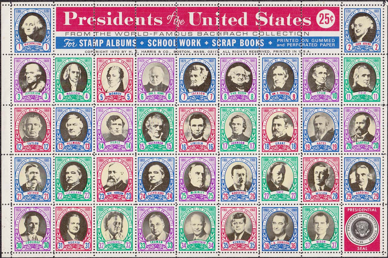 Знаки данного выпуска печатались в листе разм. 217 х 144, содержащем 45 (9 х 5) шт. виньеток. Из них 37 щт с портретами президентов, остальные с текстами.