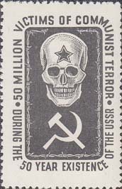 1967 г. Разм. по перфорации 29 х 46 мм. В центе на сплошном фоне череп с пятиконечной звездой. Внизу серп и молот. По наружному периметру текст на английском языке: "50 миллионов жертв коммунистического террора за 50 лет существования СССР".