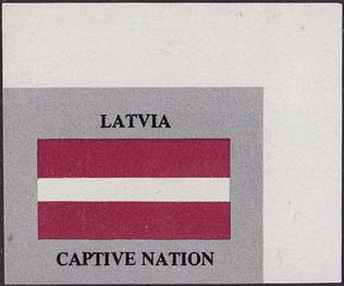1980(?) г. Разм. рис. 40 х 31 мм. Трехцветная печать на белой бумаге. С клеем. В центре флаг Латвии. Сверху и снизу текст на английском языке: "Латвия в плену".