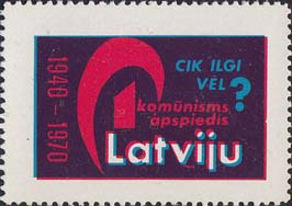 1970 г. Разм. рис. 36 х 22 мм. Трехцветная печать на белой глянцевой бумаге. Зубц. 12 1/2. В центре на сплошном фоне стилизованное изображение и текст на латышском языке. Слева вертикально дата: "1940 - 1970".