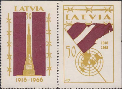 1968 г. Разм. по перфорации 33 х 50 мм. Двухцветная печать на белой бумаге. В центре различные рисунки и тест на английском языке: "Латвия 50 1918 1968".