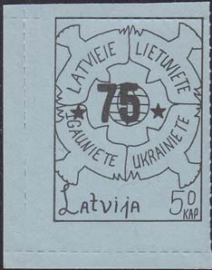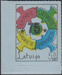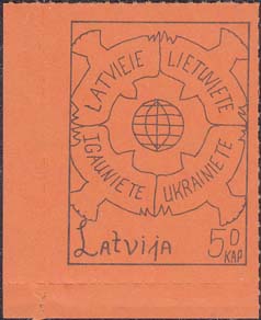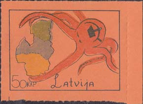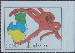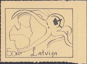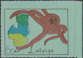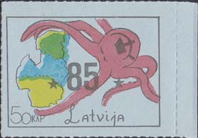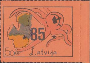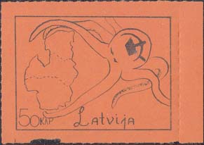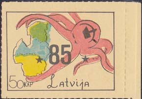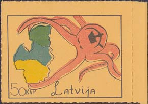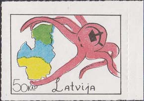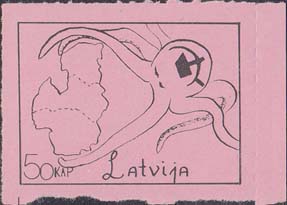 1980(?) г. Разм. по перфорации ≈ 44 х 33 мм. Одноцветная и многоцветная печать на бумаге различных цветов. Линейная просечка. С клеем. В прямоугольной рамке разм. 37 х 28 мм примитивный рисунок. Спрут с серпом и молотом на голове протягивает щупальца к схематической карте балтийских стран. Внизу номинал и текст на английском языке: "Латвия".
