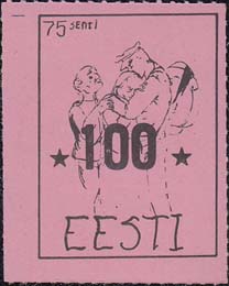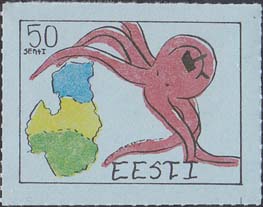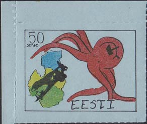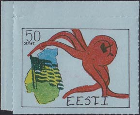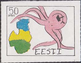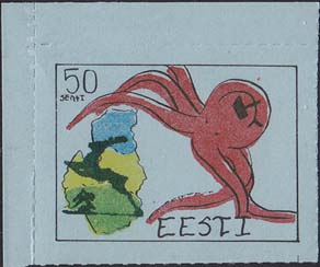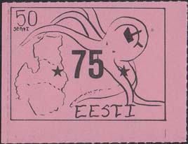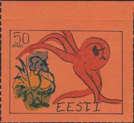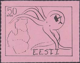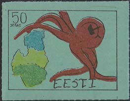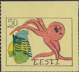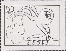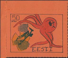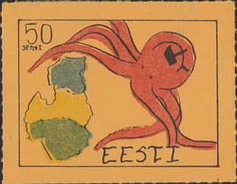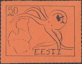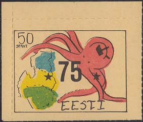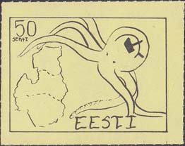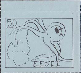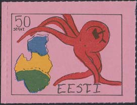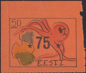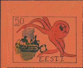 1980(?) г. Разм. по перфорации ≈ 44 х 33 мм. Одноцветная и многоцветная печать на бумаге различных цветов. Линейная просечка. С клеем. В прямоугольной рамке разм. 37 х 28 мм примитивный рисунок. Спрут с серпом и молотом на голове протягивает щупальца к схематической карте балтийских стран. В левом верхнем углу номинал. Справа внизу текст на английском языке: "Эстония".