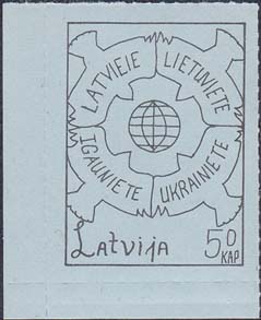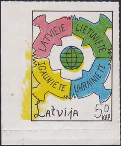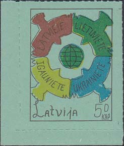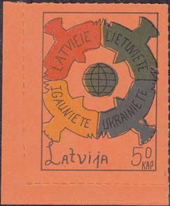 1980(?) г. Разм. по перфорации ≈ 34 х 46 мм. Одноцветная и многоцветная печать на бумаге различных цветов. Линейная просечка. С клеем. В прямоугольной рамке разм. 28 х 37 мм примитивный рисунок. В центре изображение земного шара. о окружности четыре голубя с текстами на латышском(?) языке: "Латвия, Литва, Эстония, Украина". Внизу текст: "Латвия" на английском языке и номинал.