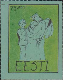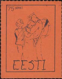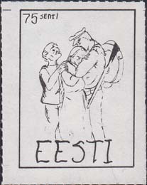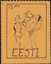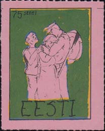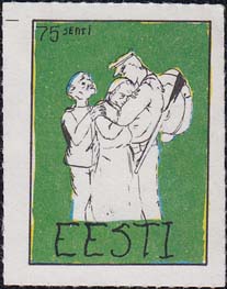 1980(?) г. Разм. по перфорации ≈ 34 х 45 мм. Одноцветная и многоцветная печать на бумаге различных цветов. Линейная просечка. С клеем. В прямоугольной рамке разм. 27 х 37 мм примитивный рисунок. Солдат прощается с семьей. В левом верхнем углу номинал. Внизу текст на английском языке: "Эстония".