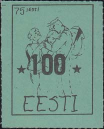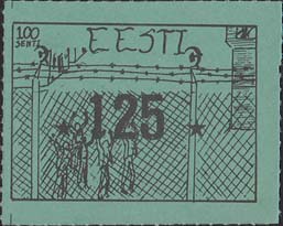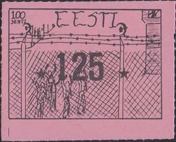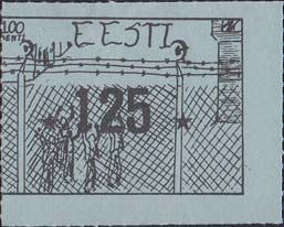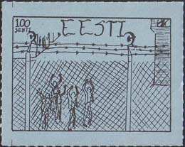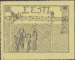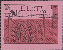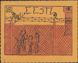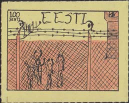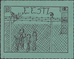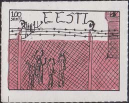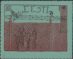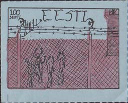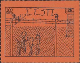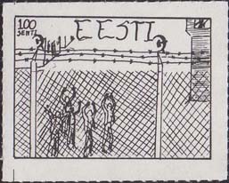 1980(?) г. Разм. по перфорации ≈ 44 х 34 мм. Одноцветная и многоцветная печать на бумаге различных цветов. Линейная просечка. С клеем. В прямоугольной рамке разм. 37 х 27 мм примитивный рисунок. Группа людей за колючей проволокой. Сверху номинал и текст на английском языке: "Эстония".