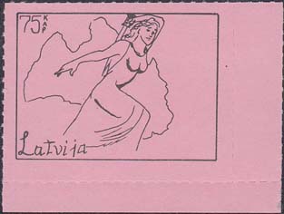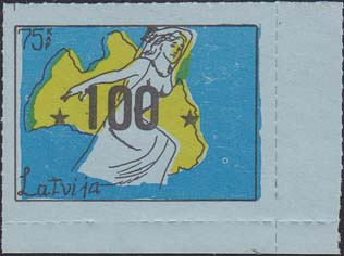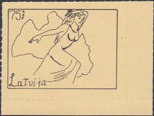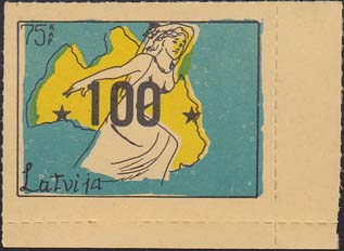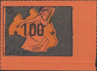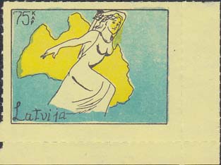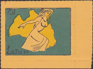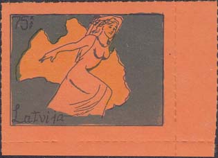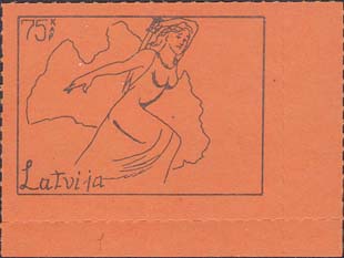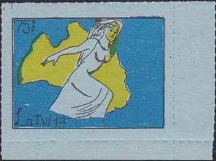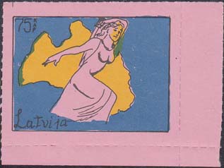 1980(?) г. Разм. по перфорации ≈ 47 х 34 мм. Одноцветная и многоцветная печать на бумаге различных цветов. Линейная просечка. С клеем. В прямоугольной рамке разм. 37 х 27 мм примитивный рисунок. Фигура женщины с мечом на фоне карты Латвии. В левом верхнем углу номинал. Слева внизу текст на английском языке: "Латвия".