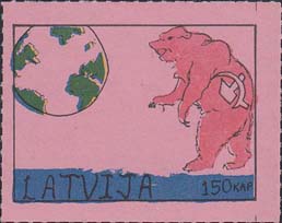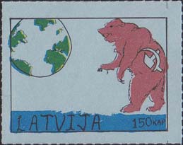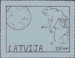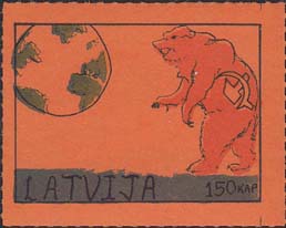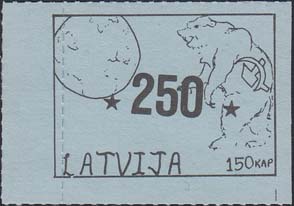 1980(?) г. Разм. по перфорации ≈ 45 х 34 мм. Одноцветная и многоцветная печать на бумаге различных цветов. Линейная просечка. С клеем. В прямоугольной рамке разм. 37 х 27 мм примитивный рисунок. Земной шар и медведь с серпом и молотом. Внизу текст на английском языке: "Латвия" и номинал.